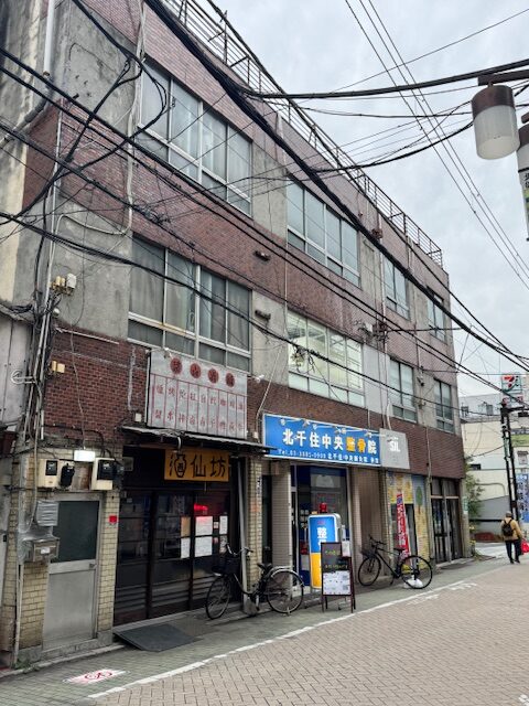 左手に中華料理店『酒仙坊』や『北千住中央整骨院』が1階に入ったビルが見えます。このビルが目的地です。