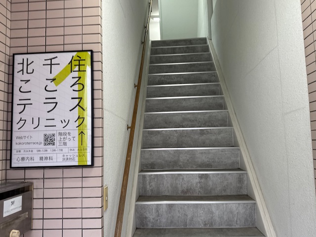 当クリニックはビルの3階です。 誠に恐れ入りますが、ビルにはエレベーターがなく、階段のみのご利用となります。ご不便をおかけいたしますが、あらかじめご了承の上、お気をつけてお越しください。